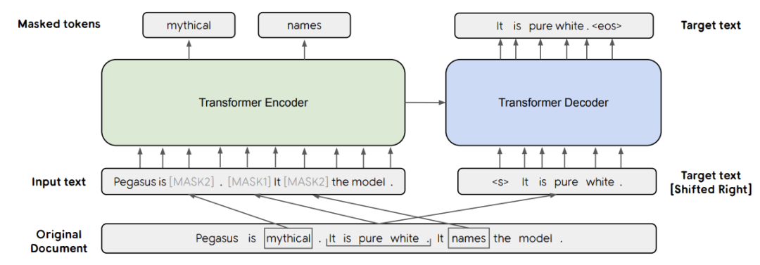 图1: PEGASUS的基本架构是一个标准的Transformer encoder-decode。在这个例子中,GSG和MLM同时作为预训练目标。原始文本有三句话。一个句子被[MASK1]屏蔽,并用作目标生成文本(GSG)。其他两句话仍然保留在输入中,但是一些词被[MASK2] (MLM)随机屏蔽了。