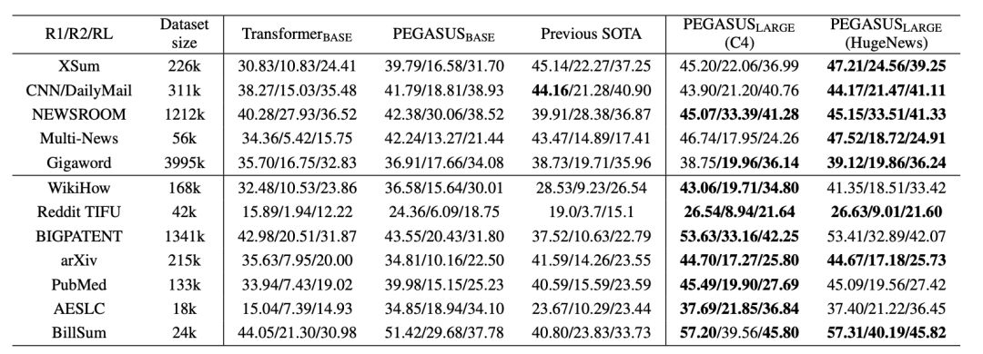 表1:与之前的SOTA相比,PEGASUSLARGE和PEGASUSBASE在所有下游数据集上的结果