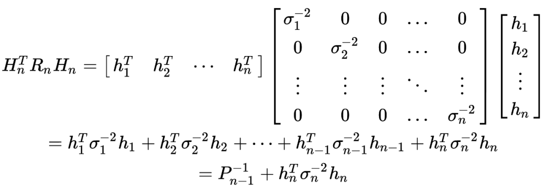 从递推最小二乘法推导出卡尔曼滤波的过程并不严谨,直接使用先验估计来替换掉递推最小二乘法中的一些项。如果以后有更加严谨的方式我会补上证明。