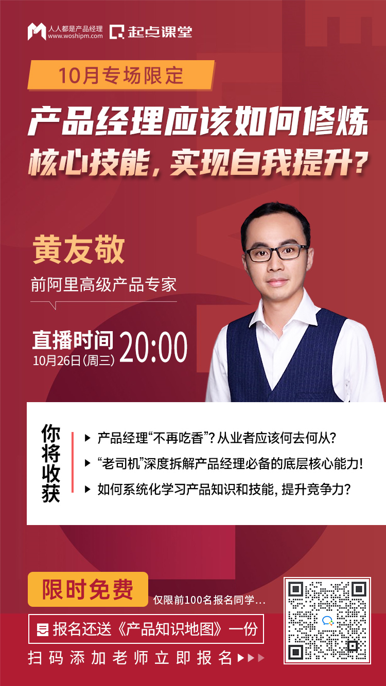 为了帮助大家解决产品核心技能不足的问题,我们特邀前阿里高级产品专家@黄友敬老师在线直播。