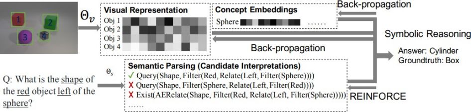 除了经典的自然语言处理任务和新体系结构的改进之外,一些新任务也越来越受欢迎,其中包括需要与计算机视觉交互的任务。论文《The NeuroSymbolic Concept Learner: Interpreting Scenes, Words, and Sentences From Natural Supervision》提出了一个从图像和文本中自动学习概念的模型。它引入了一种结合语义解析、视觉解析和符号推理的体系结构(NSCL)。它发现使用由此产生的概念更容易解析新句子:用更少的训练数据就能达到最先进的水平。视觉问题回答(即看图回答问题)是评估该模型的任务之一。