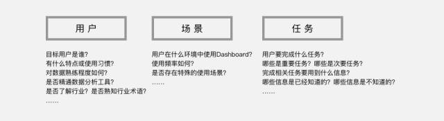 如上图,了解用户对数据和行业的熟悉程度等,可以辅助判断提供与用户水平相匹配的数据分析能力。同时,也可以从中判断是否需要嵌入内容注释和辅助信息等,帮助用户理解。而在场景和任务中,用户行为本身就受场景影响,设计Dashboard时要考虑不同场景下具体任务的合理性和重要程度,在后续处理内容时辅助判断优先级。