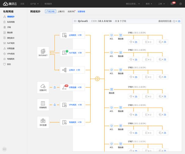 内容相互之间具有一定的逻辑关系,如地理位置关系、数字包含关系、对象父子关系等,这种结构可以让对象之间的逻辑关系十分直观。如腾讯云VPC网络拓扑,将资源对象的位置和关系抽象表示,很直观的呈现了资源对象之间的相互关系。