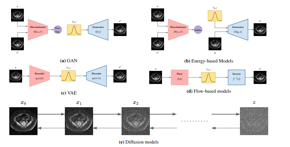 图1:在这个图中,我们展示了生成模型的变革及其背后的见解。(a)通用对抗网络(GAN)[1]是一种端到端管道,它以对抗方式训练生成器以生成鉴别器能够与真实数据样本区分的样本。(b)基于能量的模型(EBM)[2],也称为非归一化概率模型,训练方式与GANs相同,但有两个主要修改。首先,鉴别器学习一个适当的基于能量的函数,该函数将数据样本映射到分布空间。其次,该生成器利用先验输入来提高样本生成性能。(c)变分自动编码器(VAE)[3]是一个独立的网络,它跟随编码器从数据样本到低维潜在空间的投影,并通过解码器路径对其进行采样生成。(d)归一化流(NF)[4]利用可逆流函数将输入转化为潜在空间,并生成具有逆流函数的样本。(e)扩散模型在连续的步骤中将噪声与输入混合,直到它成为一个噪声分布,然后在采样过程的每一步中应用逆向过程来中和噪声附加。