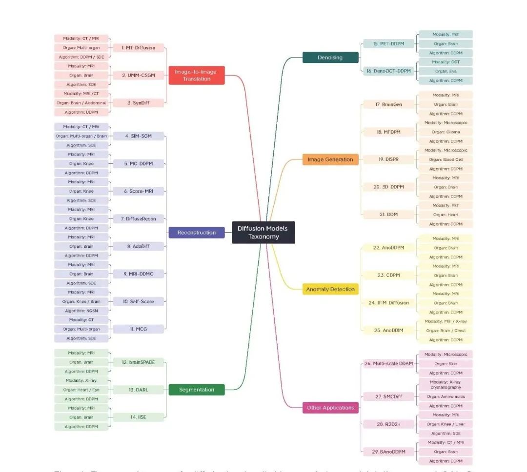 我们设计了医学界扩散模型的多视角分类,提供了扩散模型及其应用研究的系统分类。我们将现有的扩散模型分为三类:去噪扩散概率模型、噪声条件评分网络和随机微分方程。此外,我们将扩散模型的应用分为七个类别:异常检测、去噪、重建、分割、图像间翻译、图像生成和其他应用。