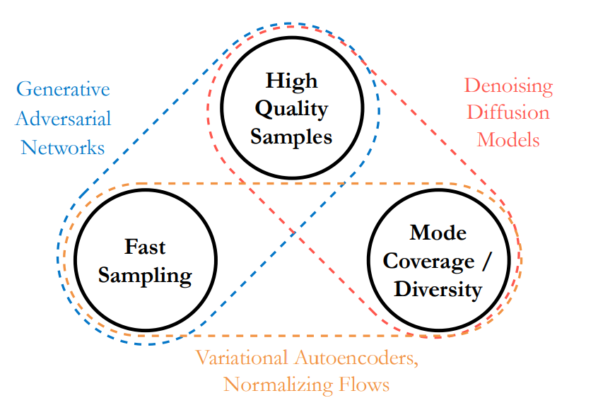 图2:生成式学习试验[14]。尽管GANs能够快速生成高保真样本,但其模式覆盖是有限的。此外,价值流和标准化流已被揭示具有很大的多样性;然而,它们的采样质量通常很差。扩散模型通过显示足够的模式覆盖和高质量的采样来弥补VAEs和GANs的不足。然而,由于它们的迭代性质,这导致了一个缓慢的采样过程,它们实际上是昂贵的,需要更多的改进。