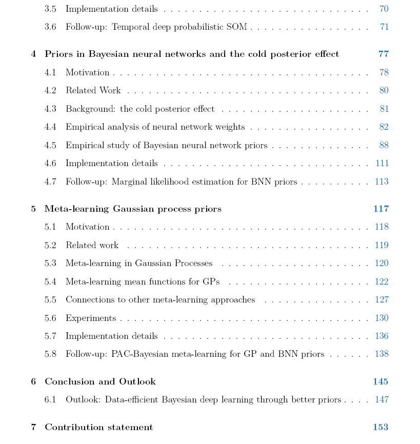 具体地说,我们证明了变分自编码器中的高斯过程先验可以改进时间序列的表示学习,并允许对缺失数据进行有效的插补,同时还可以提供校准的不确定性估计。我们还表明,通过使用变分高斯-马尔可夫过程,这是可能的,在没有显著的额外计算成本。此外,我们表明,在变分自编码器中使用自组织映射作为结构归纳偏差,可以提高学习表示的可解释性,并使有效的潜在聚类。这些聚类表示可以作为潜在时间序列模型的输入,从而准确地预测未来的状态。在贝叶斯神经网络中,我们证明了常用的各向同性高斯先验不仅会导致次优性能,而且在某些情况下还会产生所谓的冷后验效应,即经过缓和的后验比真正的贝叶斯后验表现更好。相反,我们提出了具有重尾性和空间相关性的备选先验,可以提高性能,缓解冷后验效应。最后,当没有先验知识可用时,我们表明先验分布可以在元学习环境中从相关任务中学习。在深度神经网络高斯过程的情况下,我们表明元学习的均值函数和核函数的先验改进预测性能和不确定性估计。