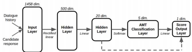 图 2:评分模型的计算图,基于行为价值函数和统计策略参数化用于模型选择策略。该模型包含一个带有 1485 个特征的输入层、一个带有 500 个隐藏单元的隐藏层、带有 20 个隐藏单元的隐藏层、带有 5 个输出可能性的 softmax 层(对应论文章节 4.3 中的 5 个 AMT 标签)、一个标量值输出层。虚线箭头表示一个 skip 连接。