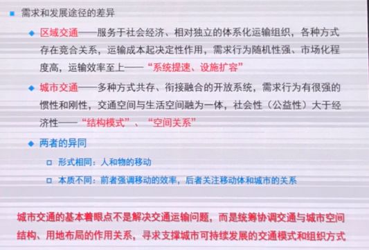 区域交通服务于社会经济、相对独立化的体系化运输组织,它的需求行为随机性强、市场化程度高,所以我们在处理区域交通时,多采用系统提速和设施扩容。城市交通的生成机理、交通行为、交通密度、空间组织、技术选择等都带有强烈的城市基因,是多种方式共存,衔接融合的开放系统,其社会性大于经济性。在城市里面,大量出行是刚性的,或者说是有惯性的。