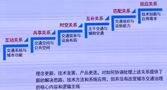 城市交通治理是立足于城市,因此,要科学合理地处理好相关关系:互动关系、共享关系、时空关系、互补关系、匹配关系、效应关系。理念、技术的发展,产品的更迭,对如何协调处理上述关系提供了新解决思路,技术方法,但并没有改变城市交通治理的根本问题。