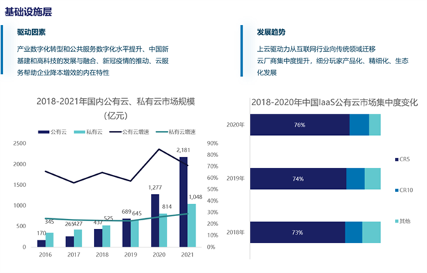 在基础设施层,上云驱动力从互联网行业向传统领域迁移云厂商集中度提升,细分玩家产品化、精细化、生态化发展。