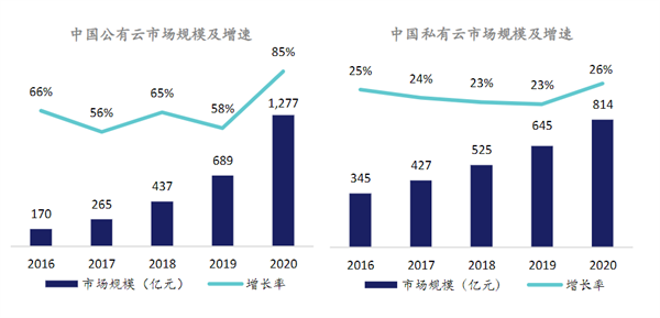 近年来,中国云计算市场保持高速增长,根据中国信通院数据,2020年我国云计算整体市场规模2091亿元,同比增长56%,其中公有云市场规模1277亿元,同比增长85%,私有云市场规模814亿元,同比增长26%。