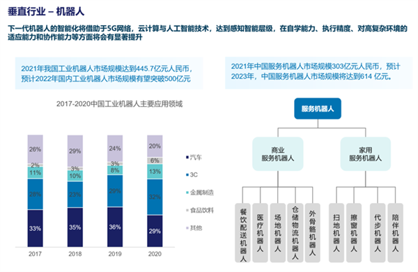 最后,在机器人领域,基于云计算的超强运算能力和5G的强大通信能力,人工智能技术在机器人上的应用成为可能。目前机器人主要分为工业机器人和服务机器人两大类。就前者来说主要呈现出国际化、场景化、智能化的发展趋势;后者在个性化需求定制以及大数据赋能方面不断加强,并呈现出场景不断细分的趋势,此外国内服务机器人凭借技术、性价比等方面的优势,不断撬开海外市场。