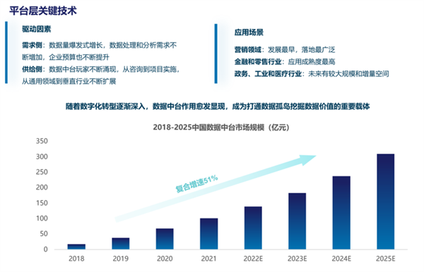 在平台层,随着数字化转型逐渐深入,数据中台作用愈发显现,成为打通数据孤岛挖掘数据价值的重要载体。