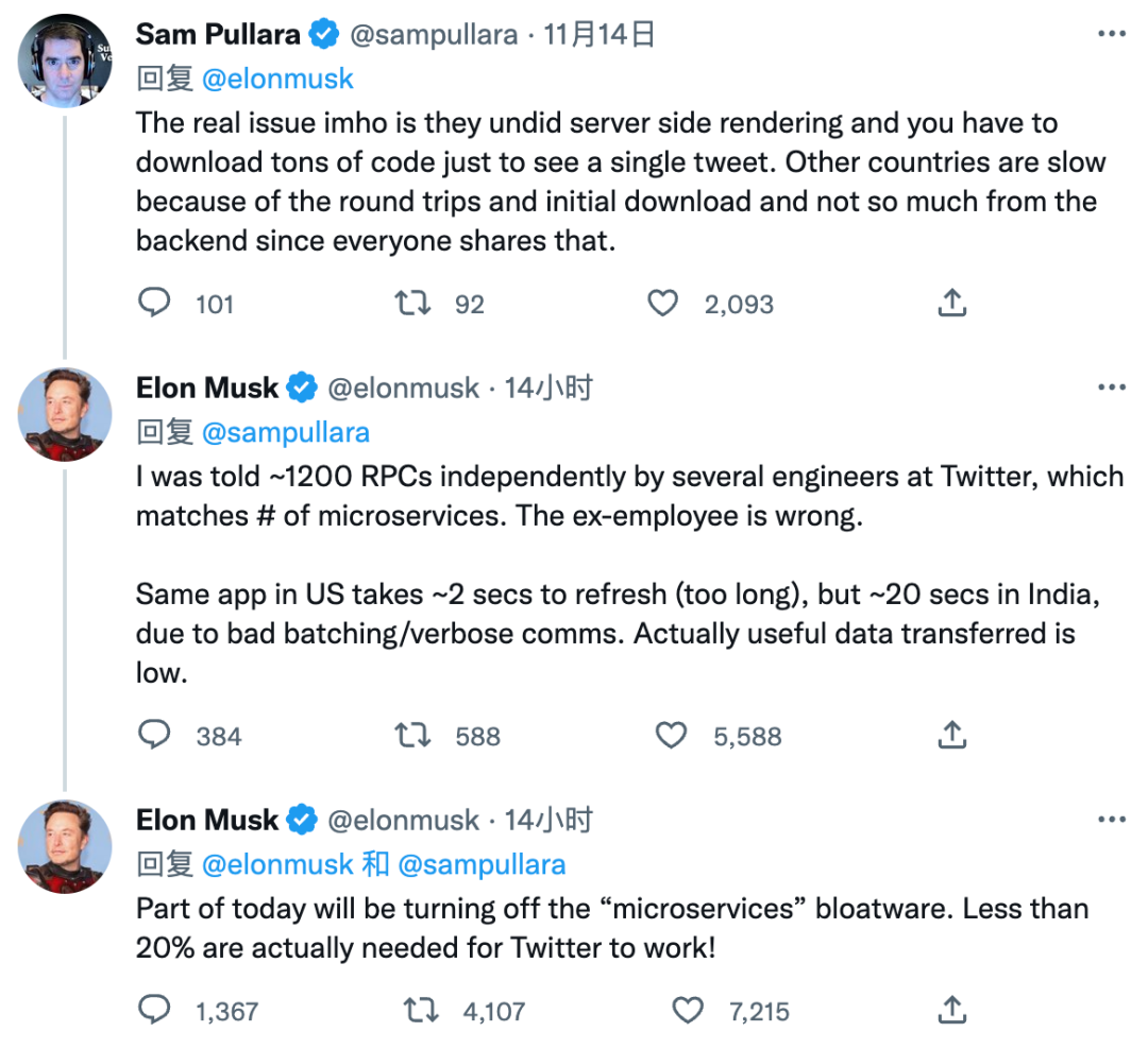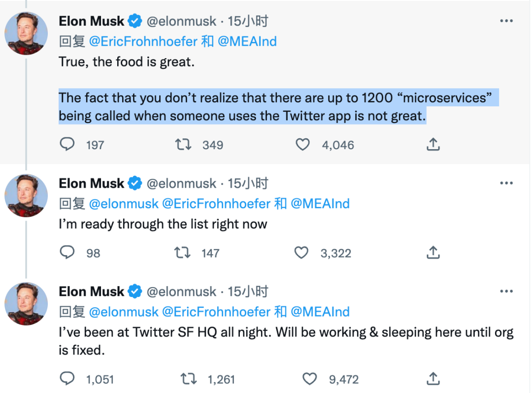 本来以为是一场纯粹的技术问题讨论,然而画风却逐渐走偏。被这样“打脸”之下,各方的面子上也有些不太好看,似乎是为了澄清最初的推文,马斯克再次在这名工程师的推文下方回应称,“事实上,当有人使用 Twitter 应用程序时,有多达 1200 个’微服务‘被调用,你没有意识到这一点并不好。”