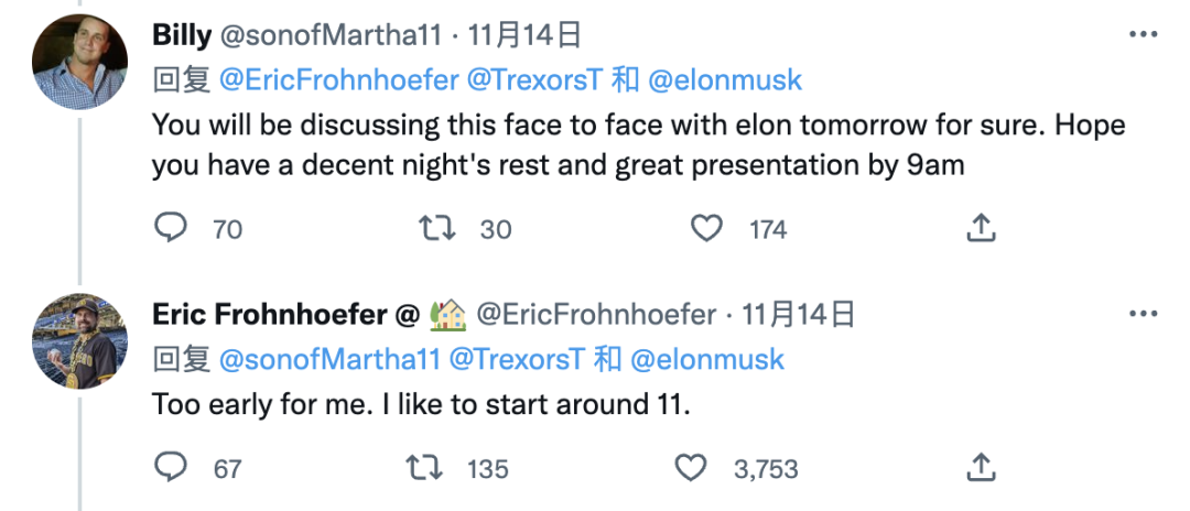 鉴于双方直接在 Twitter 上争锋相对,也有不少网友劝解 Eric Frohnhoefer,「明天你肯定会和 Elon 面对面讨论这个问题。希望你在早上 9 点前有一个体面的休息和精彩的分享」。