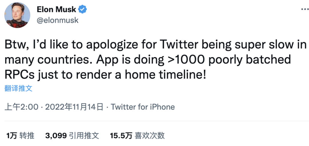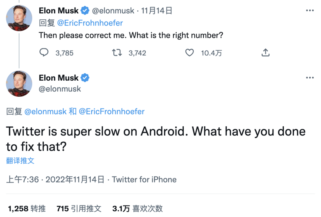 「我们已经做了大量工作来提高性能,我们发现它与增加 UAM 和广告支出密切相关。我同意(马斯克提到的一点),(Twitter)在 Android 系统上还有很多性能改进的空间。但是,我不认为请求的数量是主要问题。