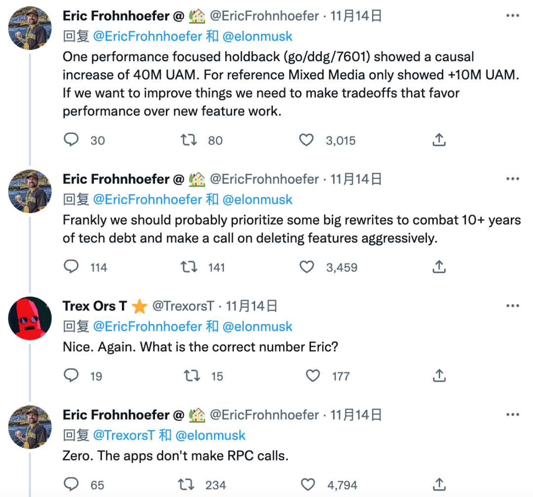 在 Eric Frohnhoefer 看来,如果 Twitter 想要改进一些东西,就需要做出有利于性能而不是新功能工作的权衡。其也表示,“坦率地说,我们可能应该优先考虑一些重大的推翻重写任务,以解决过去 10 多年的技术债务,并且删除一些功能。”
