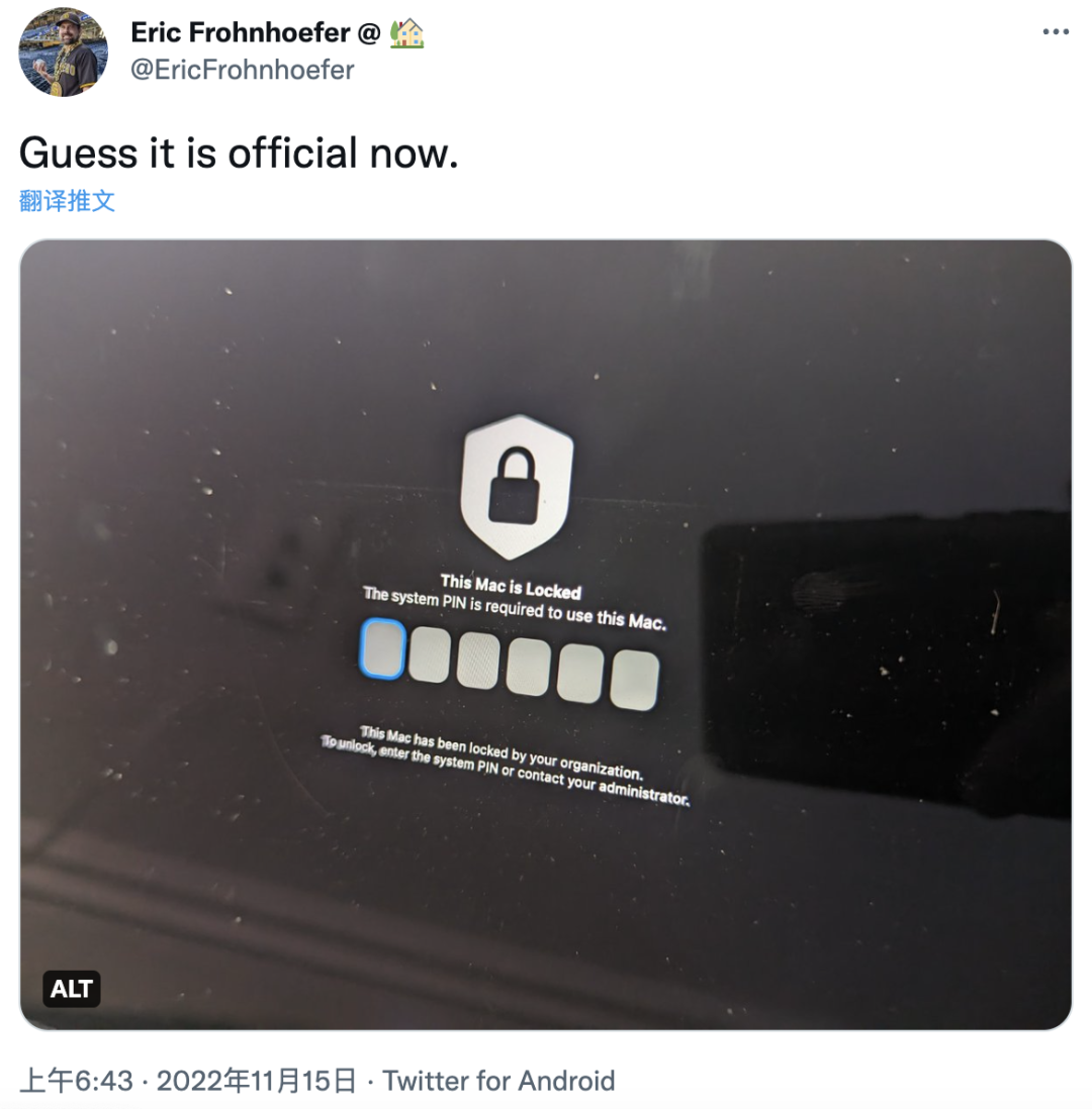 几个小时之后,Eric Frohnhoefer 无奈地发了推文,表示他的电脑已经被公司锁定。