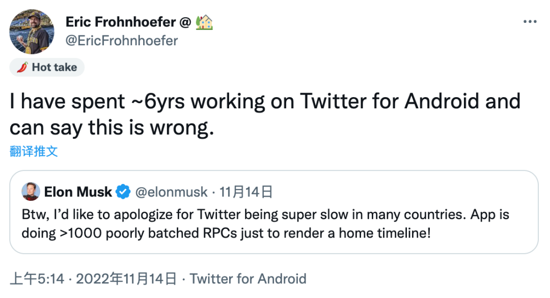 回归马斯克最初提问的本意,或只是为了这款应用在很多国家/地区运行缓慢而道歉,最终却被工程师引向了运行在 Android 系统上的问题,甚至被自家的工程师公开谴责。基于别人的规劝,Eric Frohnhoefer 依然也不愿就此妥协,并说道:也许他(马斯克)应该私下问问题,也可以使用 Slack 或电子邮件。