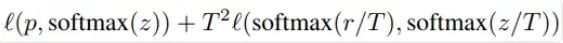 给定输入,假定p是真正的概率分布,z和r分别是学生模型和教师模型最后一个全连接层的输出。之前我们会用交叉熵损失l(p,softmax(z))来度量p和z之间的差异,这里的蒸馏损失同样用交叉熵。所以,使用知识蒸馏方法总的损失函数是