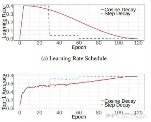 下面是带有warmup的学习率衰减的可视化图[4]。其中,图(a)是学习率随epoch增大而下降的图,可以看出cosine decay比step decay更加平滑一点。图(b)是准确率随epoch的变化图,两者最终的准确率没有太大差别,不过cosine decay的学习过程更加平滑。