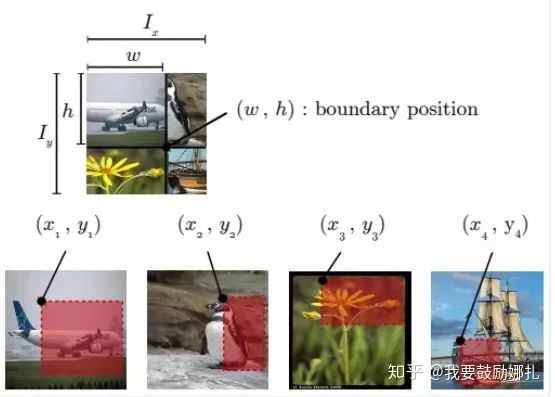 如下图所示,Ix, Iy是原始图片的宽和高。w和h称为boundary position,它决定了四个裁剪得到的小图片的尺寸。w和h从beta分布Beta(β, β)中随机生成,β也是RICAP的超参数。最终拼接的图片尺寸和原图片尺寸保持一致。