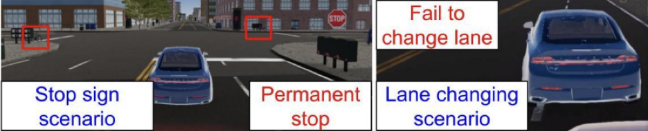 此外,我们还展示了攻击者可以在停止标志的场景下使用停在十字路口周围的自行车来触发停车线前的永久停车。此外,在变道场景中,如果攻击者在特定条件下跟随受害车辆,它则放弃变道决定 (Fig. 5)。