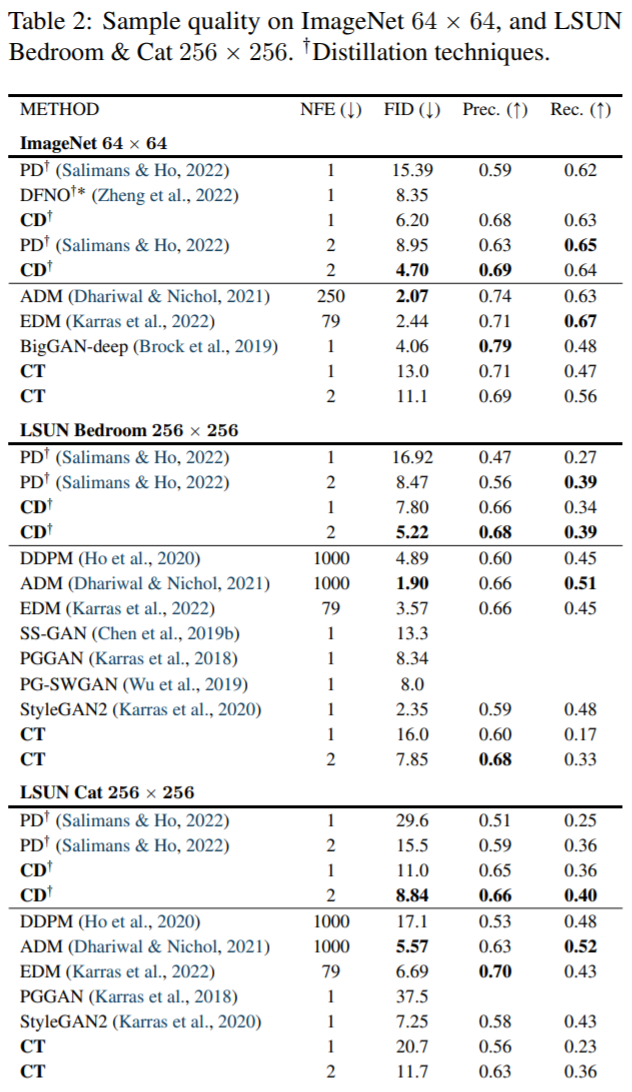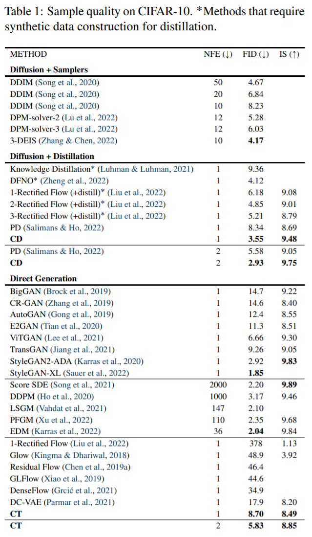 表 1 和表 2 表明 CT( consistency training ) 在 CIFAR-10 上的表现优于所有 single-step、非对抗性生成模型,即 VAE 和归一化流。此外,CT 在不依赖蒸馏的情况下获得与 PD ( progressive distillation )相当的质量,用于 single-step 生成。