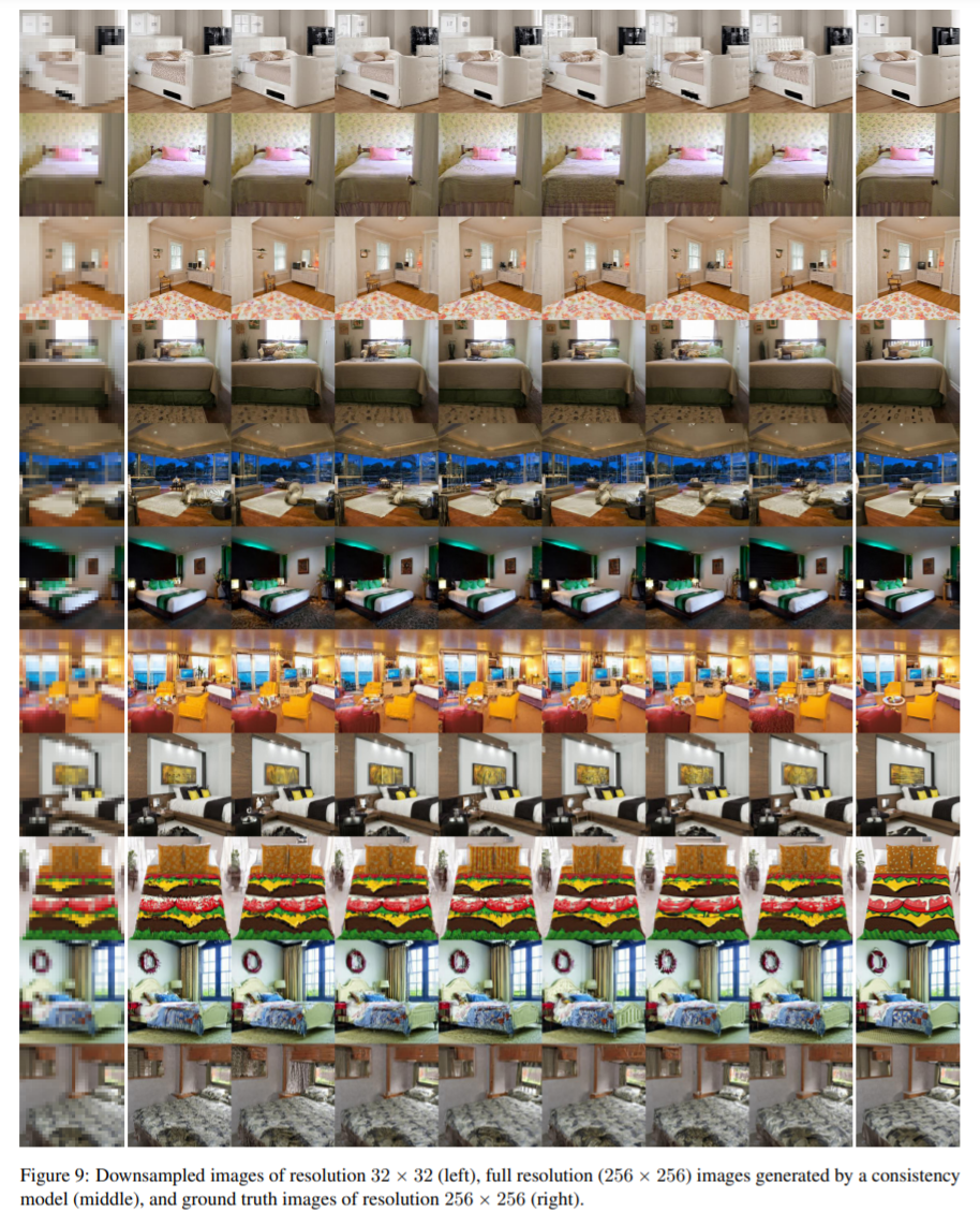 Consistency Model 生成高分辨率图像:左侧为分辨率 32 x 32 的下采样图像、中间为 Consistency Model 生成的 256 x 256 图像,右边为分辨率为 256x 256 的真值图像。相比于初始图像,Consistency Model 生成的图像更清晰。