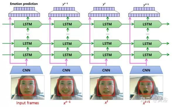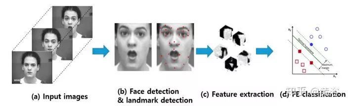 如图是一个基于深度学习模型的人脸表情识别系统:输入图像检测面部和特征,从面部成分提取时空特征,使用预训练的分类器(图像取自CK+数据集(d))确定表情。