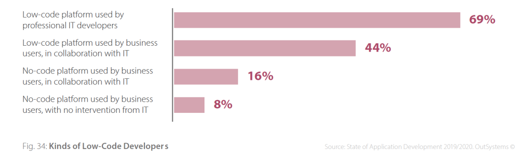 OutSystems 最近的一份报告同样显示,2019/2020年,41%的企业使用低代码或无代码工具,而2018/2019年这一比例为34% 。