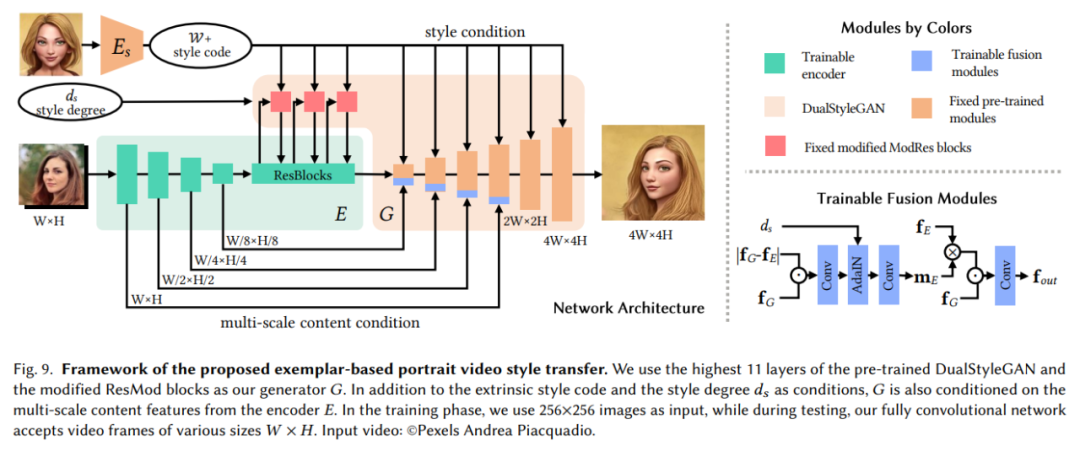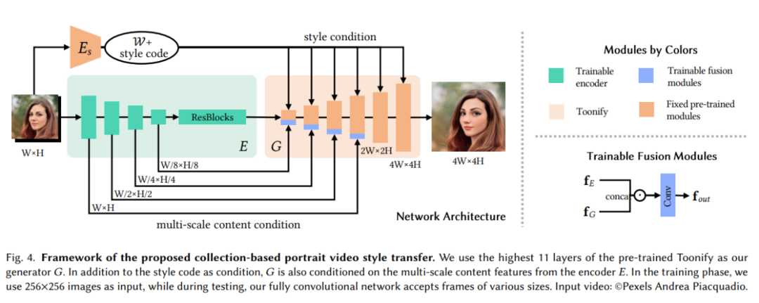 他们采用[Pinkney and Adler 2020] 的 StyleGAN 架构进行高分辨率的视频风格转换,但通过删除固定大小的输入特征和低分辨率层来调整 StyleGAN,构建了一个全新的全卷积编码器 - 生成器架构,类似于图像转换框架中的架构,支持不同的视频大小。