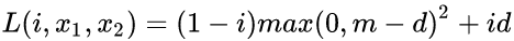 公式2为contrastive loss,x1 和 x2 为输入的图像样本对,i 为输入图像对的标签,i 为1表示是输入的图像对是正例对,i 为0表示是输入的图像对是反例对,m 表示反例对之间距离margin,d 为两个输入样本的欧式距离:。
