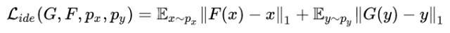 此外,作者还引入了 target domain identity loss【9】来进一步约束源域S 和目标域T 之间映射关系的学习 。该loss具体为:假定一个generator是从域S 映射到域T ,那么来自于域T 的样本通过该generator得到的还是该样本。公式1为target domain identity loss。作者实验发现,该loss能够使得迁移前后的图像在颜色组成上保持一致。