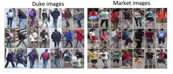 图2为分别来自于Duke和Market的图像示例,可以观察到两个数据集合有着很大的风格差异,具体体现在不同光照、背景、季节(duke拍摄于冬季、Market拍摄于夏季)等上。基于数据集合风格差异的观察,作者从图像风格迁移的角度来对re-ID的迁移学习进行探索: