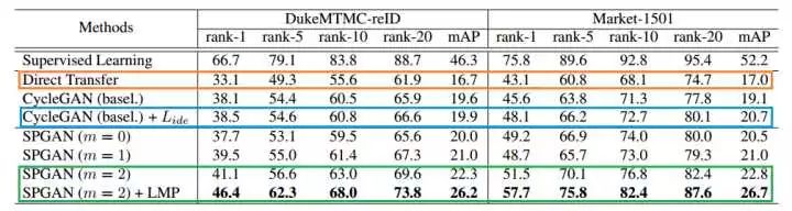 SPGAN的有效性 相比于CycleGAN以及CycleGAN+,SPGAN有者进一步的性能提升,这说明作者在训练CycleGAN的过程中加入Self-Similarity和Domain-Dissimilarity的有效性。另外作者还对公式3中的margin这个参数做了探究,发现m=2的时候性能会高一些,也就是要求负样本对距离要尽量远离。(当m=0的时候,相当于不考虑负样本对,这个时候loss退化到了content loss【13】,作者没有进一步探究)