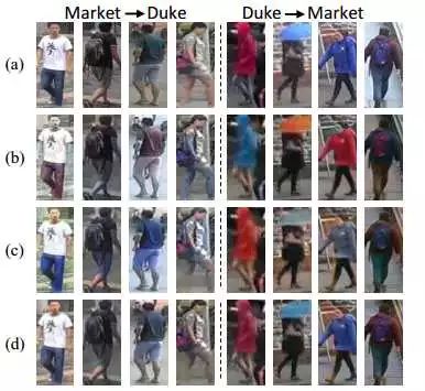 图5展示了不同模型在Marke和Duke图像之间风格相互迁移的效果图:(a)为输入图像、(b)为cyclegan模型的效果图、(c)为CycleGAN+效果图、(d)为SPGAN的效果图。可以看出