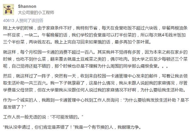 突然有一天,他收到来自校园一卡通管理中心发来的邮件,让他去领取生活补助一共三百六。但Shannon百思不得其解,他从未跟人说起我的家庭情况,为何学校会突然给他我生活补助?