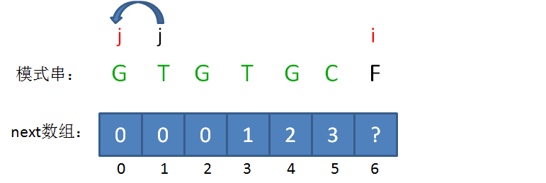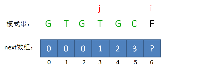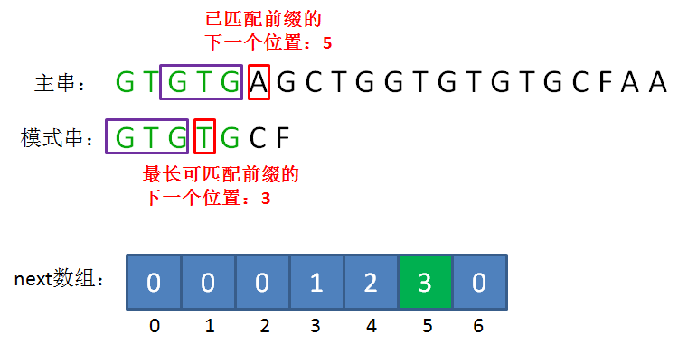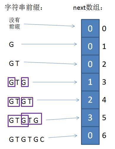 如果已匹配前缀是G、GT、GTGTGC,并不存在最长可匹配前缀子串,所以对应的next数组元素值(next[1],next[2],next[6])同样是0。