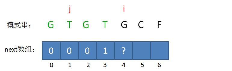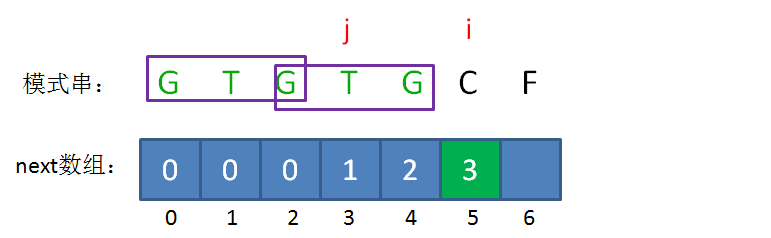 此时的已匹配前缀是GTGTG,由于模式串当中 pattern[j] = pattern[i-1],即G=G,最长可匹配前缀子串又增加了一位,是GTG。