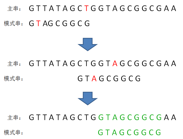 当模式串挪动到某个合适位置,逐个字符比较,发现每一位字符都是匹配时,比较结束: