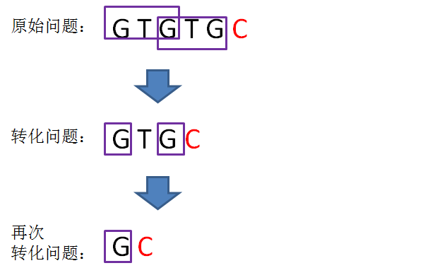 或许听起来有些绕:我们可以把计算“GTGTGC”最长可匹配前缀子串的问题,转化成计算“GTGC”最长可匹配前缀子串的问题。