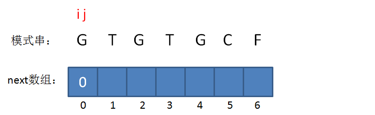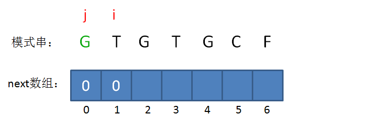此时的已匹配前缀是G,由于只有一个字符,同样不存在最长可匹配前缀子串,所以i=1,j=0,next[1] = 0。