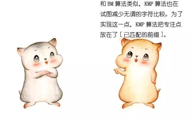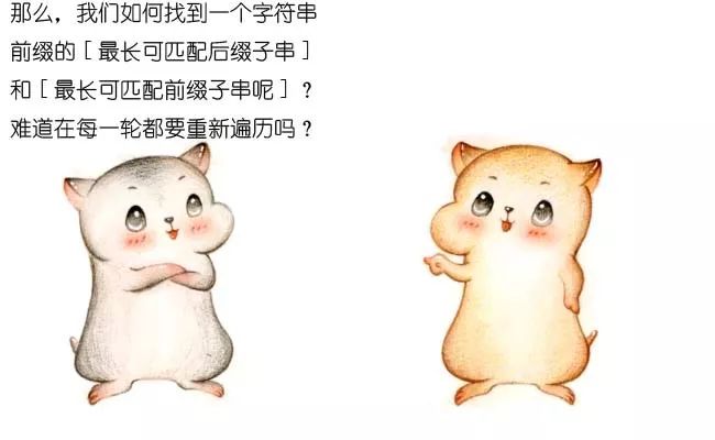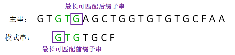 在下一轮的比较时,只有把这两个相同的片段对齐,才有可能出现匹配。这两个字符串片段,分别叫做最长可匹配后缀子串和最长可匹配前缀子串。