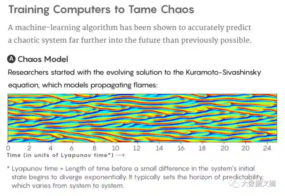 在用Kuramoto-Sivashinsky方程的演进数据进行训练后,计算机算法可以近似地预测火焰系统在未来八个李亚普诺夫时间(Lyapunov times)长度的演进。李亚普诺夫时间表示混沌系统的两个几乎完全相同的状态需要多长时间才能呈指数发散。