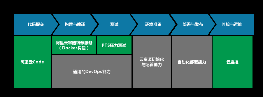 在这个流程里阿里云怎么做?代码提交部分,阿里云有云 Code ;构建与编译,阿里云有镜像服务;测试有PTS压力测试;环境准备和部署与发布这部分阿里云以前是空的;监控与运维有云监控。在通用的 DevOps 能力上我们做了一个产品叫 CodePipeline ,环境准备上我们有 Packer 、 Terraform 、 Ansible 。