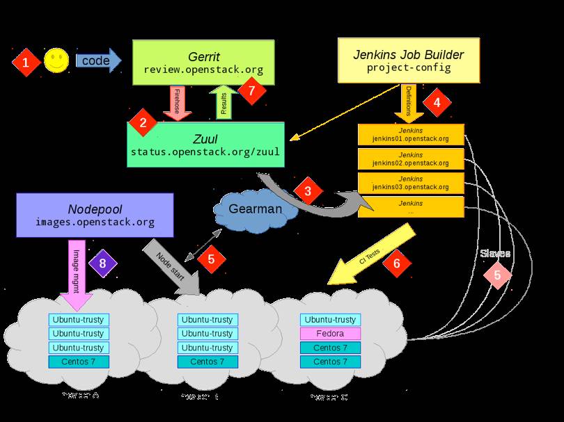 这种方式的弊端是没有一个可视化的界面直接操作,而 OpenStack 是通过上层封装了一下 Jenkins 的结构,然后通过 Zuul 的方式来做整个结构的改造。