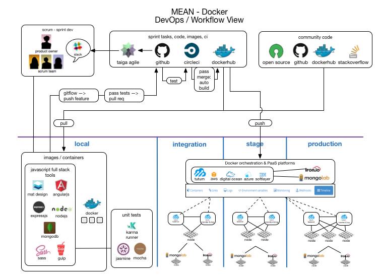 什么叫 DevOps ,这张图讲的是基于 MEAN 的 DevOps 的 Workflow ,上面有大家耳熟能详的工具和流程。