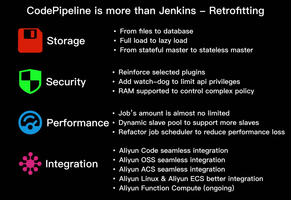 Jenkins 社区里的插件大约有几千个,我们不能保证每一个插件都是安全的,所以在 CodePipeline 开放插件的时候一定会先做一次安全扫描和安全加固。